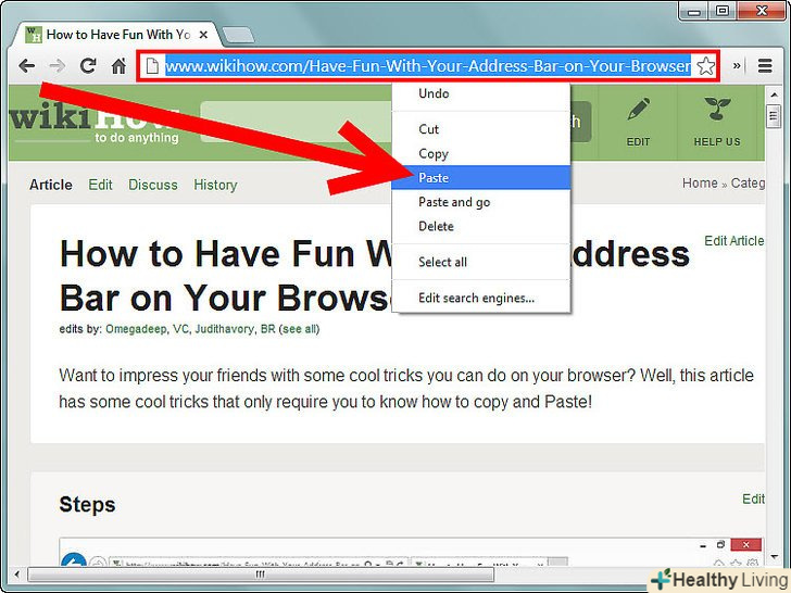 Вставте код трюку, який ви хочете використовувати в адресний рядок браузера. адресний рядок служить для введення та / або відображення адреси веб-сайту, який ви відвідуєте. Для цієї статті, вона буде містити ( https://www.wikihow.com/Have-Fun-With-Your-Address-Bar )