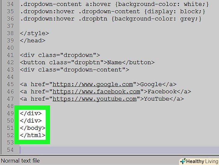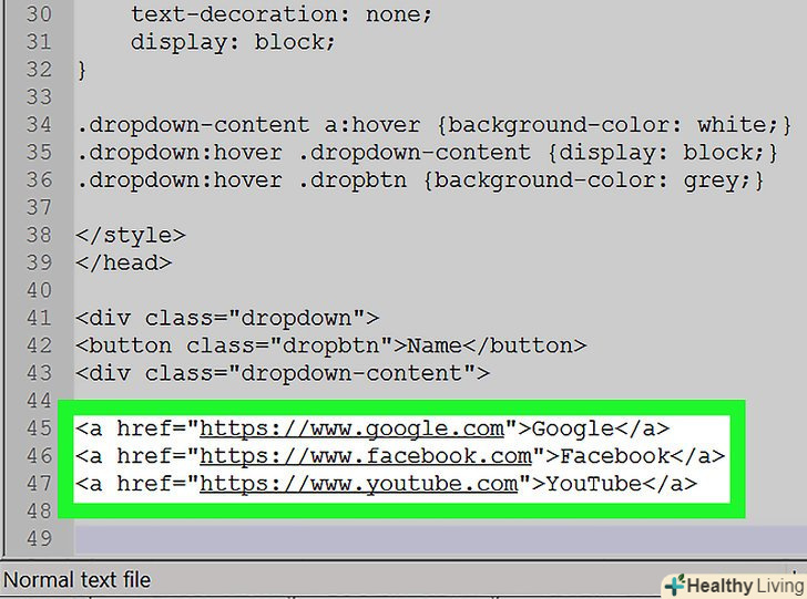 Перегляньте код випадаючого меню. Код повинен виглядати приблизно так: [2]lt;!DOCTYPE htmlgt; lt;Htmlgt; lt;Headgt; lt;Stylegt; .Dropbtn { Background-color: Black; Color: White; Padding: 16Px; Font-size: 16Px; Border: None; } .Dropdown { Position: Relative; Display: Inline-block; } .Dropdown-content { Display: None; Position: Absolute; Background-color: Lightgrey; Min-width: 200Px; Z-index: 1; } .Dropdown-content A { Color: Black; Padding: 12Px 16Px; Text-decoration: None; Display: Block; } .Dropdown-content A:Hover {Background-color: White;} .Dropdown:Hover .Dropdown-content {Display: Block;} .Dropdown:Hover .Dropbtn {Background-color: Grey;} lt;/Stylegt; lt;/Headgt; lt;Div Class="dropdown"gt; lt;Button Class="dropbtn"gt; Social Media lt;/Buttongt; lt;Div Class="dropdown-content"gt; lt;A Href="https://www.google.com"gt; Google lt;/Agt; lt;A Href="https://www.facebook.com"gt; Facebook lt;/Agt; lt;A Href="https://www.youtube.com"gt; YouTube lt;/Agt; lt;/Divgt; lt;/Divgt; lt;/Bodygt; lt;/Htmlgt;