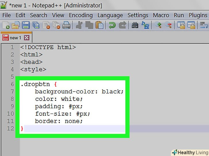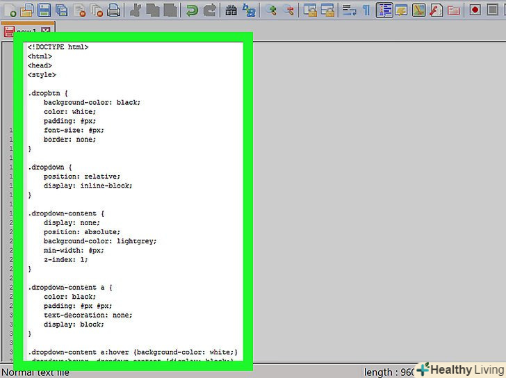 Створіть випадаюче меню. введіть наступний код, щоб задати розмір і колір меню. Замість "" введіть потрібну цифру (чим більше цифра, тим більше меню). Також в рядках "background-color" І» color " можна підставити назву потрібного кольору або його HTML-код: [1].Dropbtn { Background-color: Black; Color: White; Padding: Px; Font-size: Px; Border: None; }
