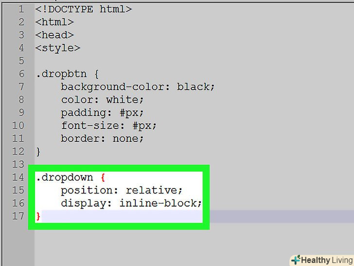 Вкажіть, що в меню будуть присутні опції. Так як опції будуть додані пізніше, помістіть їх в меню, ввівши наступний код:.Dropdown { Position: Relative; Display: Inline-block; }