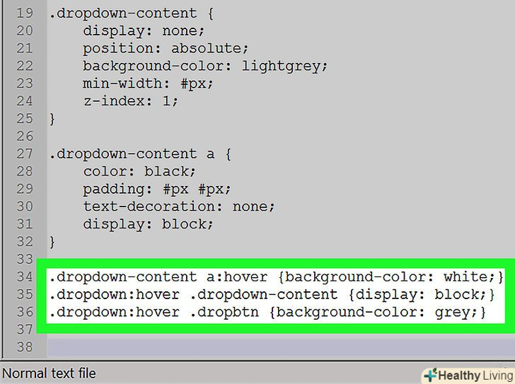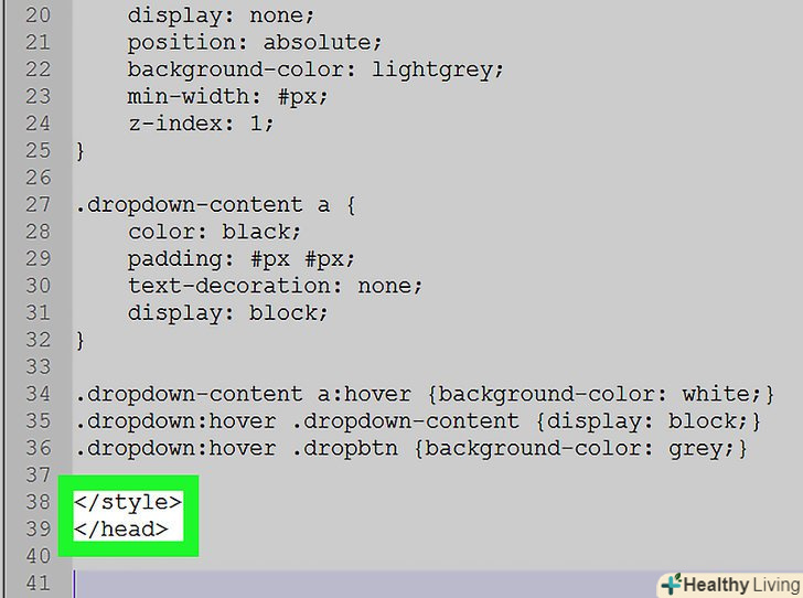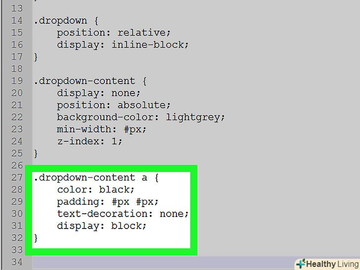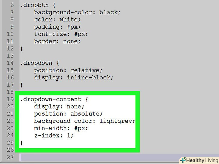 Налаштуйте зовнішній вигляд випадаючого меню. наступний код задасть розмір меню, його положення, коли зачіпаються інші елементи веб-сторінки, і колір. У рядку «min-width» замість «» підставте потрібну цифру (наприклад, 250), а в рядку "background-color" - назва потрібного кольору або його HTML-код:.Dropdown-content { Display: None; Position: Absolute; Background-color: Lightgrey; Min-width: Px; Z-index: 1; }
