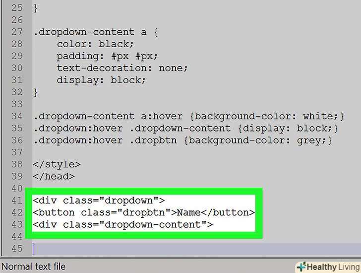 Вкажіть ім'я випадаючого меню. введіть наступний код, де «Name» замініть на слово (наприклад, «Меню»), яке відобразиться на кнопці меню.lt;Div Class="dropdown"gt; lt;Button Class="dropbtn"gt; Name lt;/Buttongt; lt;Div Class="dropdown-content"gt;