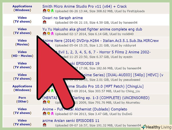 Знайдіть торрент-трекер з великою кількістю Аніме. Торрент-трекер-це сайт для пошуку потрібних файлів, якими користувачі обмінюються один з одним. Як правило, на торрент-трекерах можна знайти не тільки нові, але і старі Аніме. У пошуковику введіть " Аніме торрент "(без лапок), щоб знайти відповідні торрент-трекери. Нижче наведено список трекерів з великою кількістю Аніме. [1]- Manytorrents.net