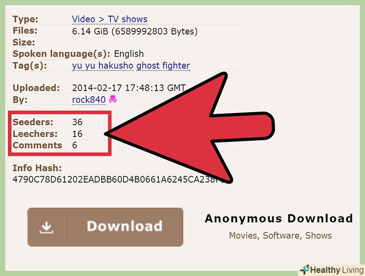 Клацніть по посиланню для скачування торрент-файлу. Торрент-файл-це невеликий файл, який управляє скачуванням потрібного вам файлу (в даному випадку Аніме). Клацаючи по посиланню, будьте уважні-деякі торрент-трекери замінюють реальну посилання фальшивої, яка веде до реклами.- Завантаження аніме, яке ви не купували, вважається незаконним. Можливо, вам доведеться заплатити штраф або понести більш суворе покарання. Щоб отримати інформацію про те, як не попастися, прочитайте цю статтю .
