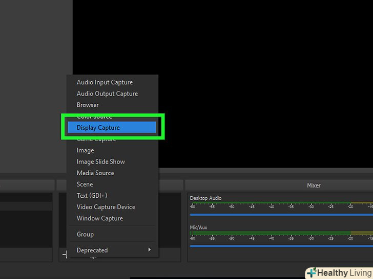 Додайте свій робочий стіл в OBS Studio. Натисніть «+» під заголовком «Джерела», натисніть «захоплення екрану» або «захоплення гри», натисніть «ОК» в нижній частині поля «створити/вибрати джерело», а потім натисніть «OK» в нижній частині вікна.