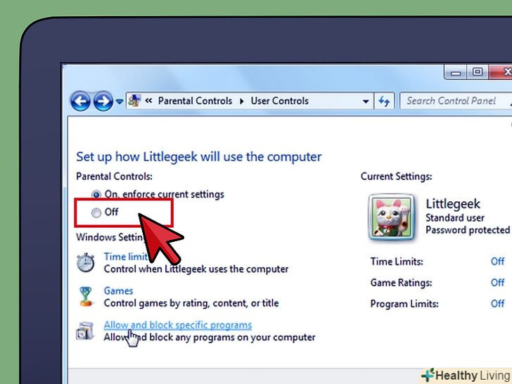1. Ви можете тимчасово відключити батьківський контроль за допомогою пароля адміністратора.повністю видаляти налаштування батьківського контролю на комп'ютері вкрай не рекомендується, так як при цьому ви втратите всі налаштування облікового запису. Відключивши ж їх тимчасово, Ви зможете потім, при необхідності, включити їх назад.[19]