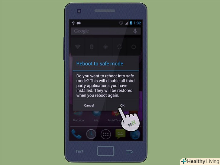 5. Вимкніть програму батьківського контролю шляхом перезавантаження пристрою в безпечному режимі (працює на більшості пристроїв версії Jelly Bean).Так як Android має досить малу кількість вбудованих функцій батьківського контролю, батьки часто самі встановлюють моніторингові та захисні додатки, щоб обмежити своїм дітям доступ до Інтернету і деяких додатків. Часом, щоб відключити всі ці функції, досить перезапустити пристрій в безпечному режимі.[7]