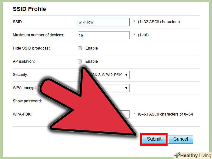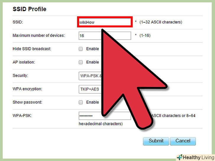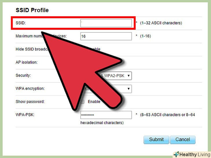 Введіть нове ім'я для вашої бездротової мережі.проявіть винахідливість, дайте бездротової мережі ім'я, яке буде виділяти вас, але не дуже особисте, тому що його будуть бачити всі в окрузі, якщо будуть шукати бездротову мережу.