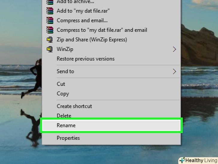 Змініть розширення dat-файлу, якщо необхідно. зробіть це, щоб не перетягувати dat-файл у вікно відповідної програми щоразу, коли захочете відкрити файл. Майте на увазі, що необхідно знати точне розширення, яке використовується для dat-файлу, так як зміна формату навіть на аналогічний формат (наприклад, MP4 на AVI) може привести до поломки файлу:- Клацніть правою кнопкою миші по файлу DAT і в меню виберіть «Перейменувати».