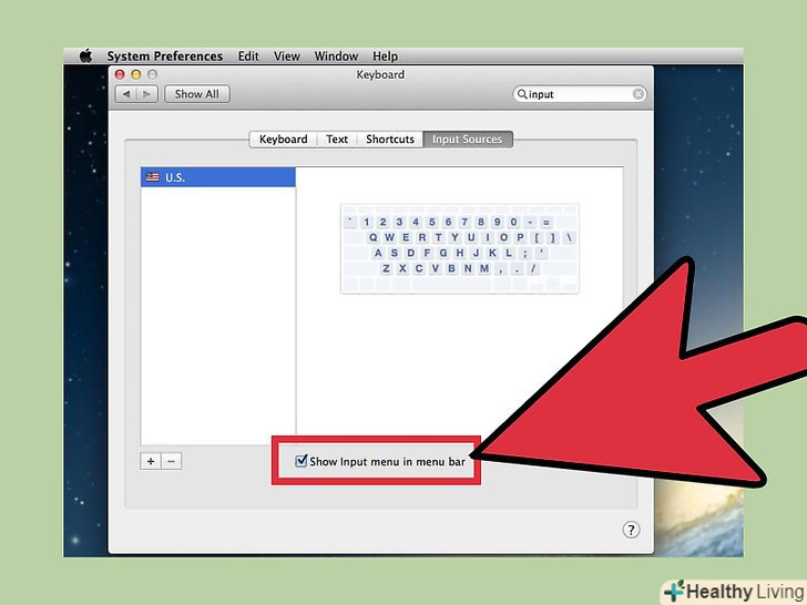 Поставте прапорець у «відобразити меню введення в рядку меню". ця опція розташована в нижній частині вікна. Відзначивши цю опцію, Ви побачите, що на правій стороні рядка меню (у верхній частині екрана) відобразиться новий значок у вигляді прапора або чорно-білої клавіатури.