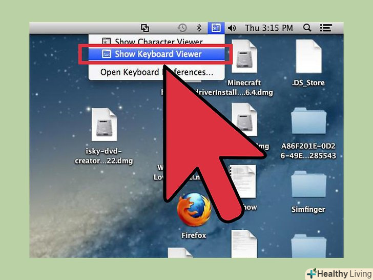 Відображення оглядача клавіатур. у рядку меню (зверху) клацніть по новому значку і виберіть «Показати оглядач клавіатур». Відкриється екранна клавіатура з символами, яких немає на вашій фізичній клавіатурі. Наприклад, затисніть клавіші ⌥ Option та/або ⇧ Shift і зверніть увагу на зміну розкладки клавіатури.- Ви можете перетягнути екранну клавіатуру в будь-яке місце на екрані. Для зміни розмірів клавіатури клацніть і перетягніть будь-який з її кутів.