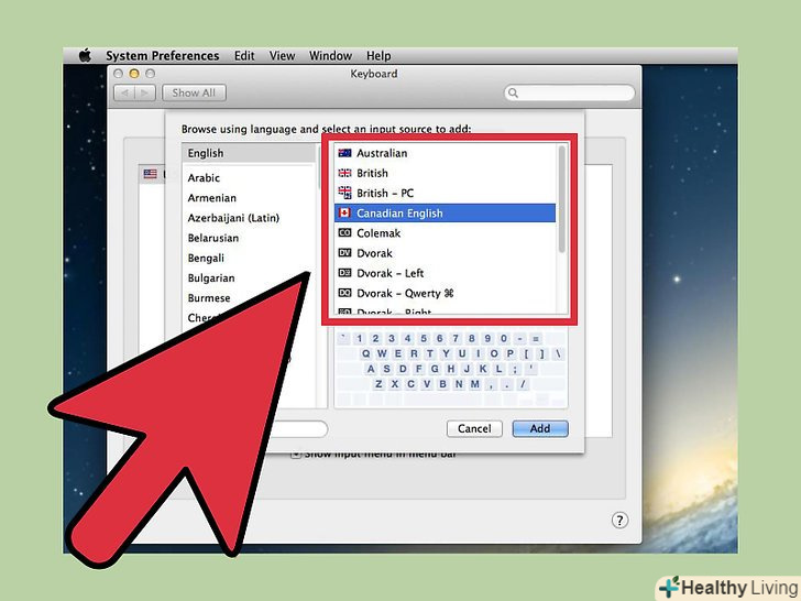 Увімкніть інші клавіатурні розкладки (за бажанням). Якщо ви вводите текст на різних мовах, поверніться до згаданого меню у вікні «Системні налаштування». Натиснути + і перегляньте доступні мови; виберіть потрібну мову і натисніть Додати . Навіть якщо ви не працюєте з декількома мовами, вам можуть стати в нагоді деякі клавіатурні розкладки.- Наприклад, Англійська мова має клавіатурну розкладку «США (Розширена)». Затиснувши клавішу⌥ Option , Ви отримаєте доступ до великого числа символів (про роботу з цією клавішею читайте вище).