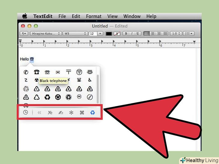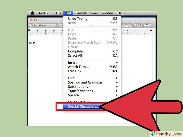 Відкрийте вікно спеціальних символів. знайдіть відповідну опцію в нижній частині розкрився меню «Правка». Залежно від версії OS X ця опція називається Смайлики і символи або Спеціальні символи . [3]- Також ви можете відкрити вікно спеціальних символів, натиснувши⌘ Command + Control + Пробіл