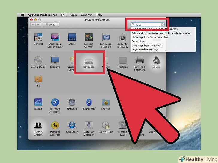 Знайдіть опцію «введення». для цього в правому верхньому куті вікна «Системні налаштування» в рядку пошуку введіть «введення» (або input). Буде виділена одна або кілька опцій. Виберіть одну з наступних опцій (якщо вона виділена):
