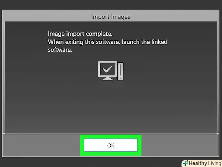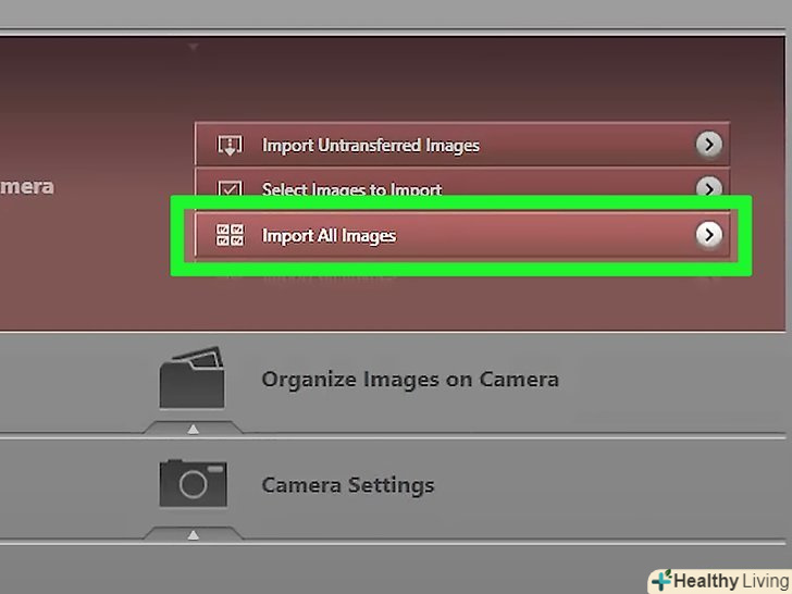 КлацнітьІмпортувати всі зображення. цей пункт знаходиться по центру меню. Почнеться передача фотографій з камери на комп'ютер.- Якщо хочете вибрати конкретні зображення, клацнітьВибрати зображення для імпорту, виберіть окремі знімки і клацніть стрілку Імпорт в правому нижньому кутку вікна.