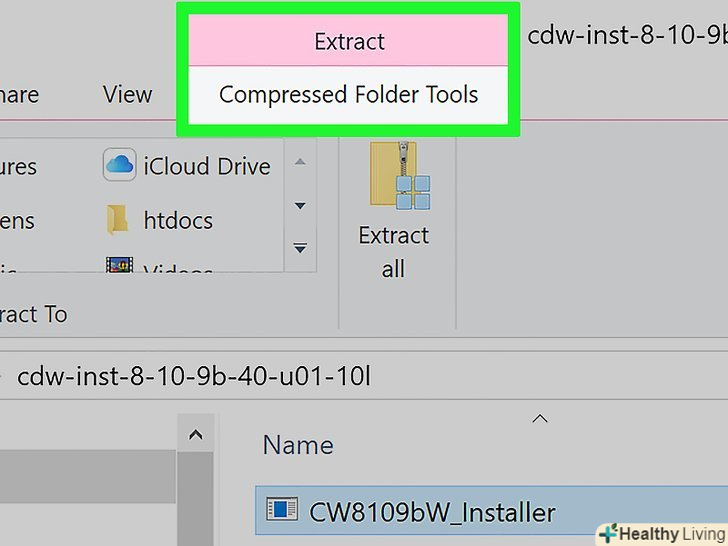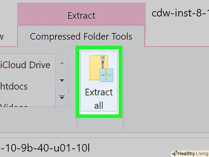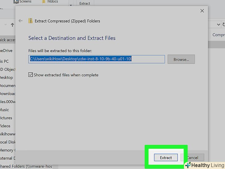 КлацнітьВитягти після запиту. Пункт знаходиться в нижній частині спливаючого вікна. Вміст Zip-архіву буде вилучено в звичайну папку, яка відкриється в новому вікні. Після вилучення можна запустити програму CameraWindow.- Не забудьте поставити прапорець "Показати витягнуті файли", інакше вам доведеться відкривати витягнуту (звичайну) папку, яка буде створена.