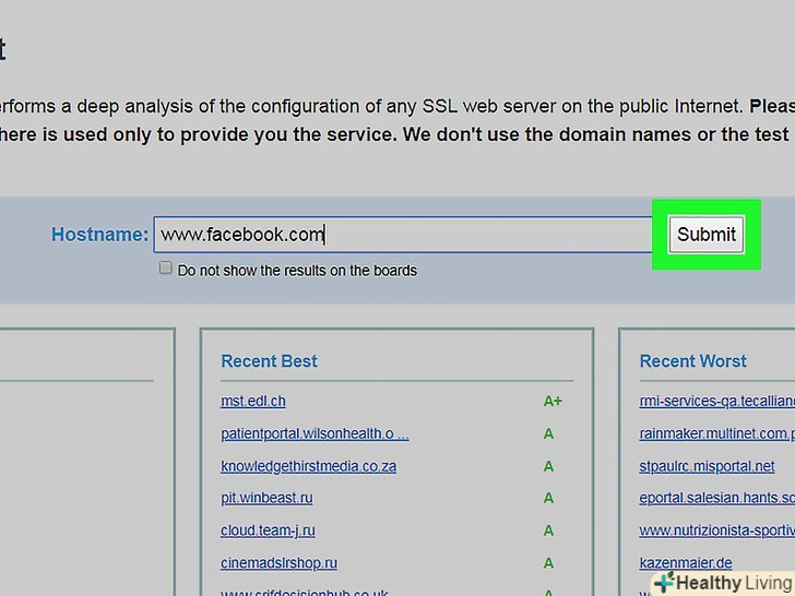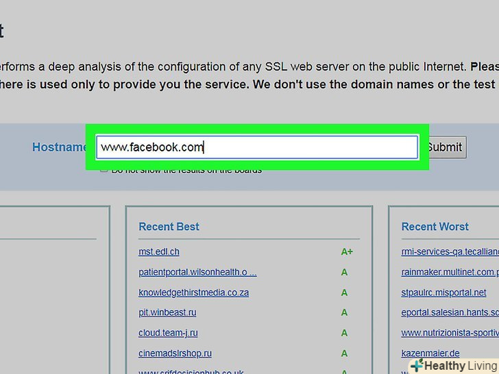 Введіть доменне ім'я сайту або його IP-адресу.зробіть це в рядку " Hostname "(ім'я хоста) вгорі сторінки.- Щоб доменне ім'я Або IP-адреса не відображалися в списку останніх запитів сервісу SSL Labs, встановіть прапорець у «Do not show the results on the boards "(не показувати результати на форумах).