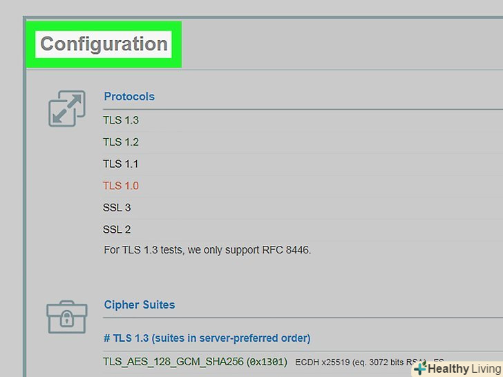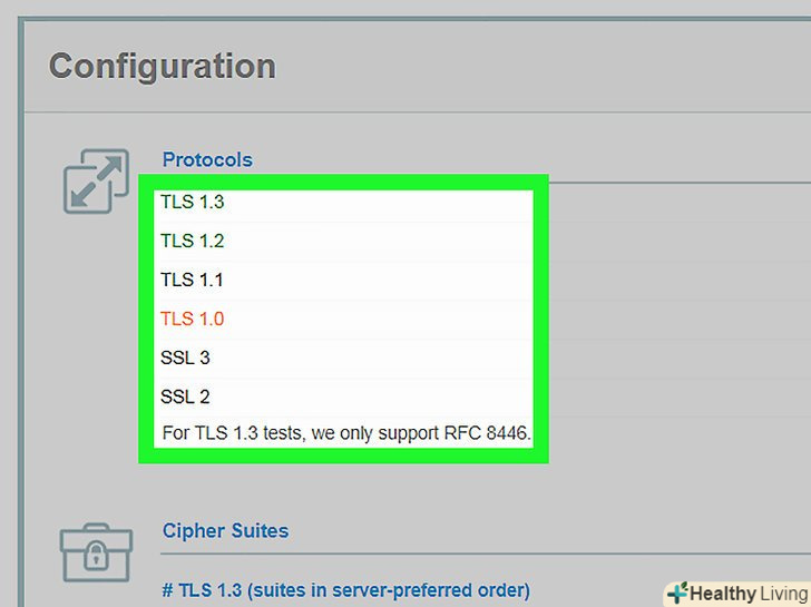 Знайдіть всі версії TLS, біля яких є слово " Yes " (так).зробіть це в розділі " Protocols "(протоколи). Ви знайдете всі версії TLS (підтримувані та не підтримувані) у верхній частині розділу "конфігурація". Версії, біля яких значиться "так", налаштовані на досліджуваному сайті.