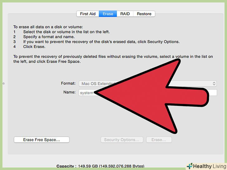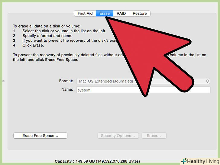 На лівій панелі дискової утиліти виберіть ім'я завантажувального диска.тепер перейдіть на вкладку "стерти". У більшості випадків ім'ям завантажувального диска є "Macintosh HD OS X".