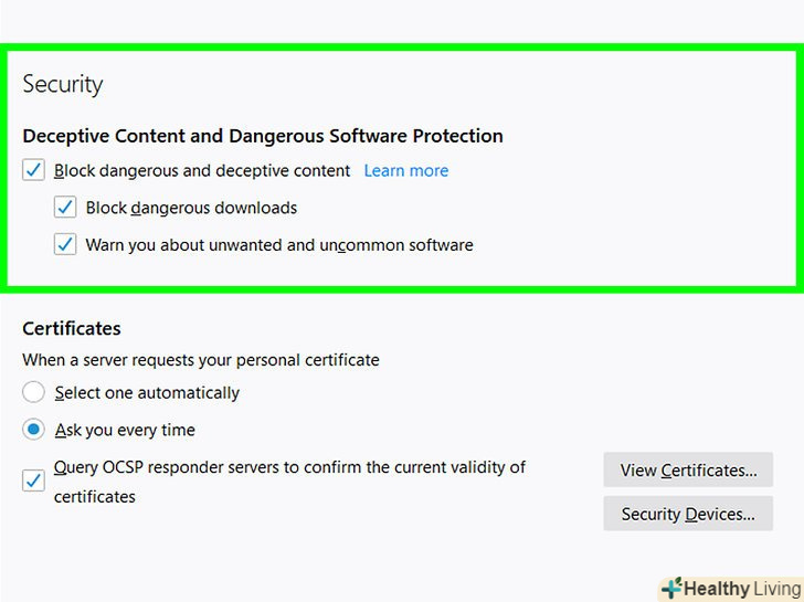Налаштуйте безпеку веб-браузера.цей процес залежить від веб-браузера. Відкрийте меню "Налаштування" у веб-браузері, а потім знайдіть параметри конфіденційності та / або безпеки. Вимкніть непотрібні / невідомі плагіни, заблокуйте шкідливі сайти і очистіть історію браузера. видаліть кукі, які відстежують особисту інформацію.[1]