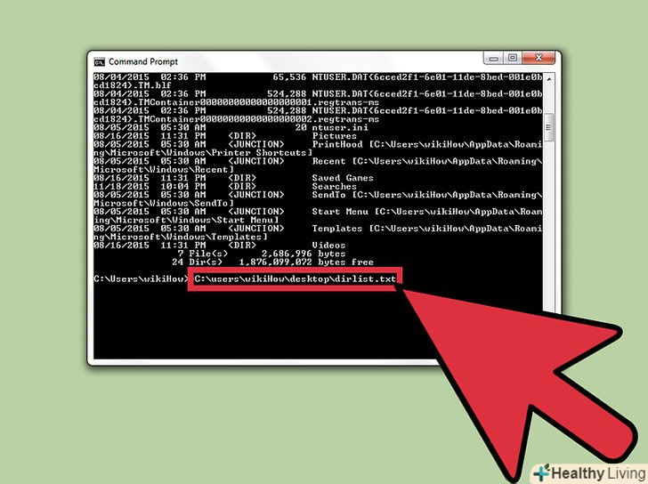 Вкажіть назву файлу і його розташування для роздруківки каталогу ваших файлів.- Наприклад, для збереження файлу на робочому столі в Windows Vista Ви повинні ввести в командному рядку " gt;C:\users\yourusername\desktop\dirlist.txt " без лапок.