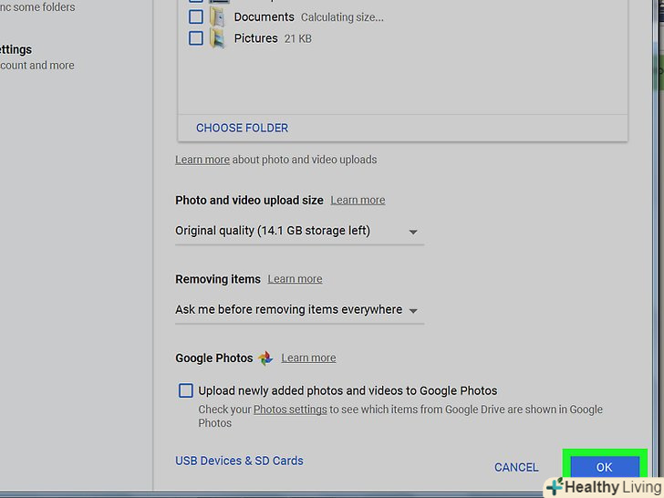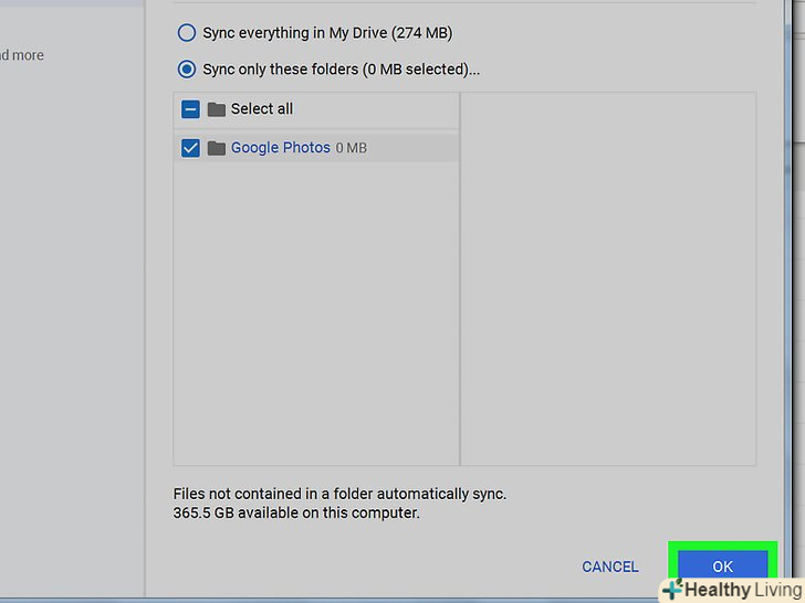 ВиберітьGoogle Фото і натисніть OK.запуститься процес скачування фотографій з Google Фото на комп'ютер. Це займе деякий час, який залежить від розміру всіх фото і швидкості вашого інтернет-з'єднання.- Щоб завантажити вміст інших папок Google Диска, також виберіть їх.