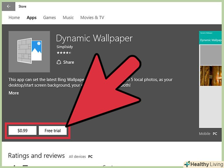 Виберіть програму.існують платні і безкоштовні програми для установки анімованих шпалер. Почитайте відгуки користувачів і виберіть додаток, яке відповідає вашим потребам.- НатиснітьВстановити додаток і дочекайтеся завершення установки на пристрої під керуванням Windows 10.