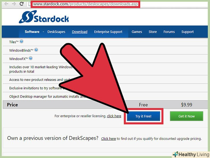 Скачайте додаток. DeskScape 8-це стороннє додаток, розроблене компанією Stardock, яке дозволяє встановити анімовані шпалери на комп'ютері під управлінням Windows 7/8/10. Stardock є розробником Deskscenes-програми, яка встановлювалася в деякі ранні версії Windows. Існує 30-денна пробна версія програми, щоб користувач міг протестувати її роботу без будь-яких витрат; після закінчення 30 днів програму потрібно купити (встановлювати заново її не потрібно).[4]- Відкрийте сайт Stardock, щоб завантажити Deskscape 8,[5] виберіть установник DeskScapes, погодьтеся використовувати 30-денну пробну версію і скачайте програму.