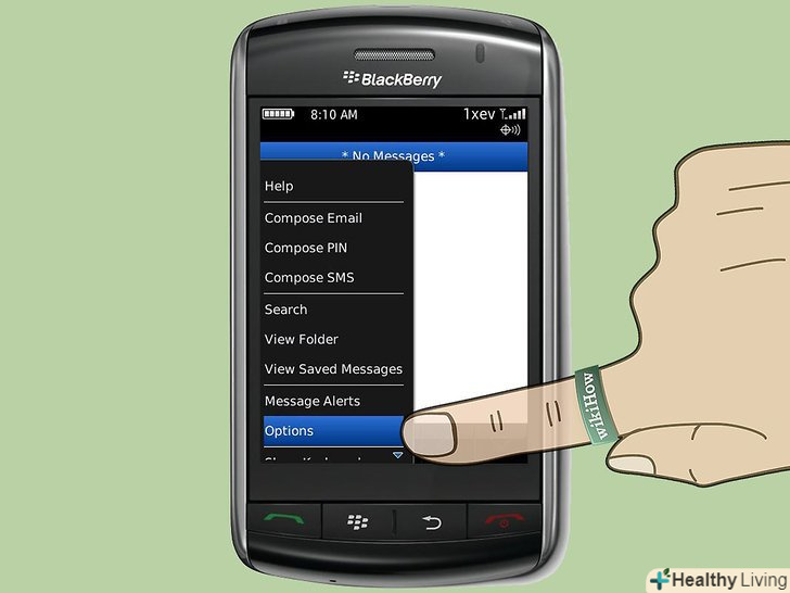 Натисніть на кнопку " Menu "і виберіть" Options.”- На деяких пристроях Blackberry, можливо вам доведеться вибрати "Text Messaging" або "SMS Text", замість вибору " Options.”