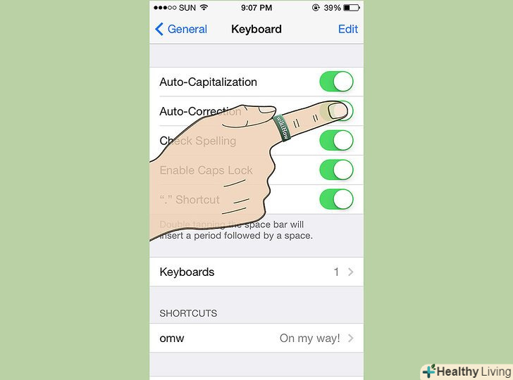 Знайдіть " Автокорекція "і переключіть повзунок на позицію"Off".Автокорекція буде відключена на вашому пристрої з iOS. [1]