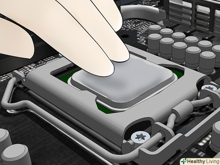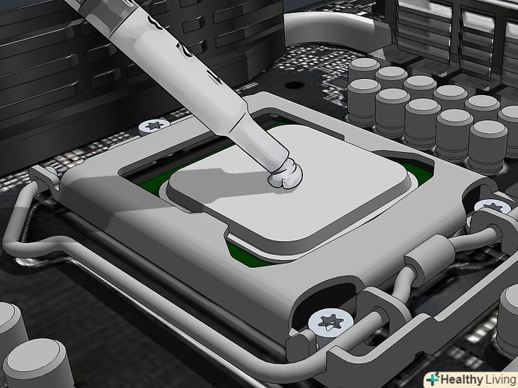 Видавіть пасту на ядро процесора.нанесіть невелику кульку нової пасти прямо на його поверхню. Досить видавити краплю розміром з рисове зерно. Якщо в керівництві по експлуатації не сказано інакше, видавіть таку ж кількість пасти і на радіатор.[20]- Термопасту можна знайти в онлайн-магазинах і в магазинах з продажу комп'ютерної техніки та іншої електроніки.
