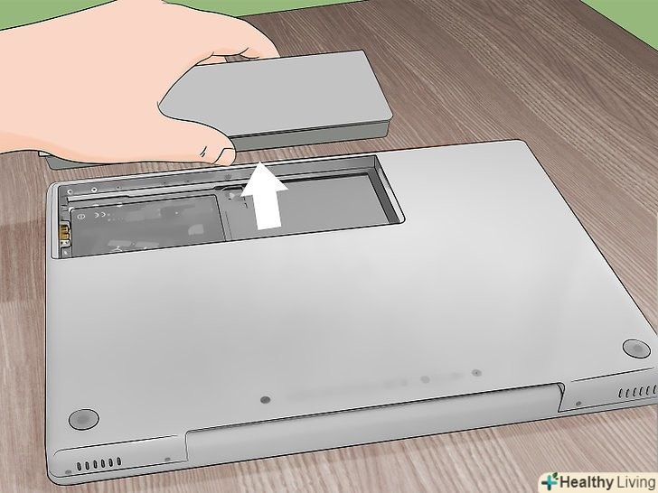 Вийміть акумулятор.якщо ви працюєте за ноутбуком, переверніть його на іншу сторону. Знайдіть відсік для акумулятора. Посуньте засувку, щоб зняти кришку. Дістаньте акумулятор і відкладіть його в сторону.[4]