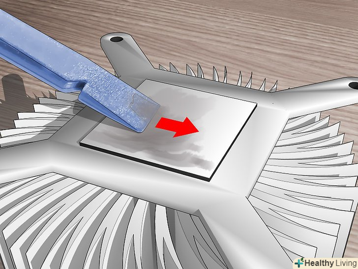 Зніміть стару пасту.знайдіть мідний сердечник радіатора. Зішкребіть якомога більше старої термопасти плоским кінцем монтажної лопатки (невеликий ручний інструмент, який використовується для демонтажу деталей).[11] Будьте гранично обережні, щоб не подряпати ніякі деталі, а якщо нервуєте з приводу цього кроку, не бійтеся перейти до наступного.[12]- Якщо ви боїтеся подряпати деталі, використовуйте суху тканину або паперовий рушник, щоб витерти більшу частину термопасти.[13]