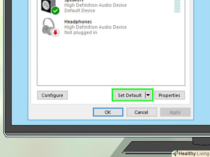 НатиснітьЗа замовчуванням. ця опція знаходиться в правій нижній частині вікна. Вибрані колонки будуть встановлені як основний пристрій відтворення-це означає, що всі звукові сигнали будуть йти через колонки (якщо, звичайно, до комп'ютера не підключені навушники).