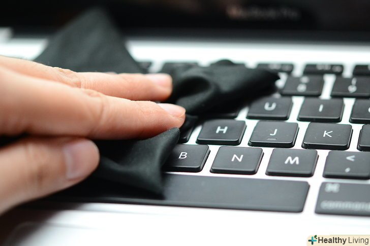 - Протріть клавіатуру ледь вологою тканиною. Використовуйте мінімум рідини для цього, а якщо використовуєте засіб для чищення, то заздалегідь переконайтеся, що воно підходить для чищення комп'ютерів (знову ж таки, використовуйте по мінімуму). Наносите засіб або воду на тканину, не на сам комп'ютер. Надлишки миючого засобу, до слова, можуть пошкодити покриття комп'ютера.