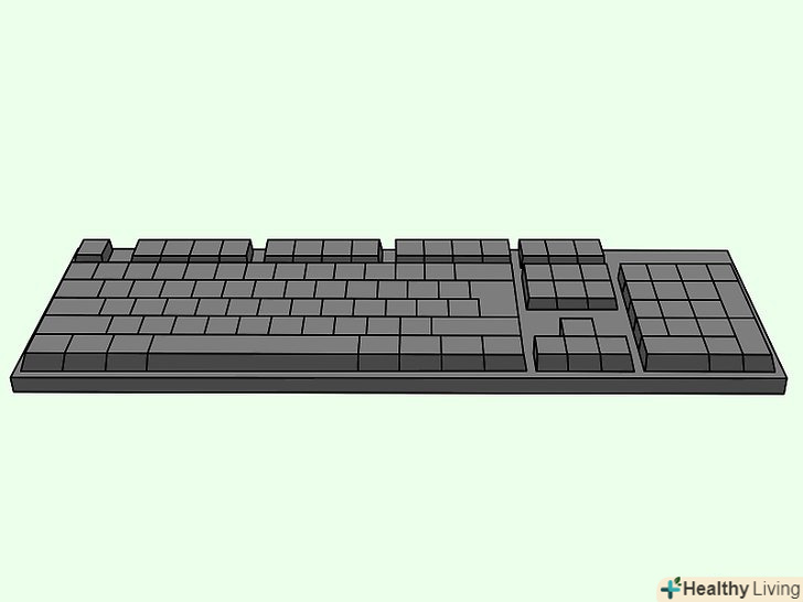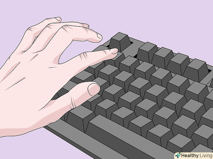 Вимкніть комп'ютер і від'єднайте клавіатуру.це необхідно для збереження комп'ютера і вашої безпеки. Спочатку вимкніть комп'ютер, потім від'єднайте від нього клавіатуру. Якщо у вас бездротова клавіатура, вийміть з неї батарейки.[13]- Вийміть з розетки шнур живлення, якщо ви працюєте на ноутбуці. Натисніть на будь-яку клавішу, щоб переконатися в тому, що ноутбук повністю вимкнений.