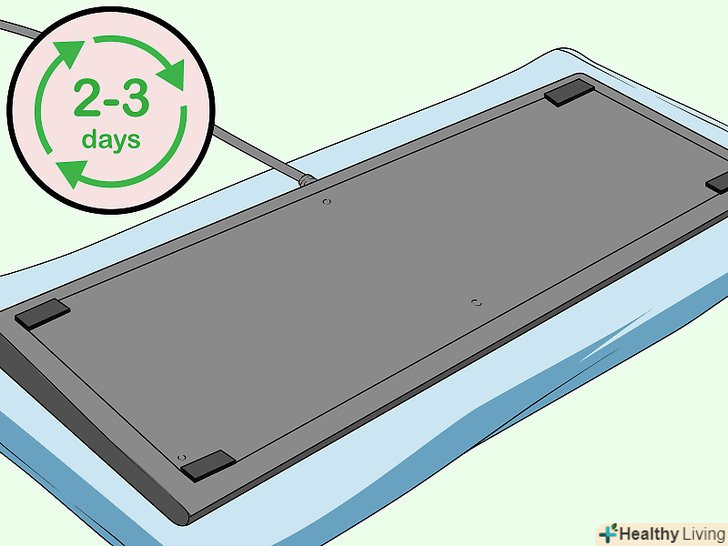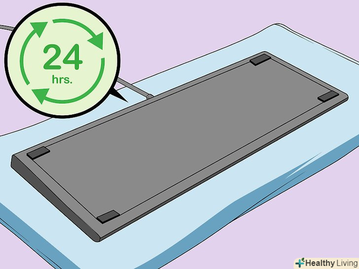 Зачекайте принаймні 24 години, щоб клавіатура висохла.покладіть клавіатуру догори дном-так з неї витече залишилася рідина. Підкладіть під клавіатуру рушник, щоб воно ввібрало рідину. Коли клавіатура висохне, її можна буде перевернути назад.[11]- У більшості випадків достатньо 24 годин, щоб висохла вся пролита рідина. Якщо у вас є час, посушіть клавіатуру 2-3 дні.