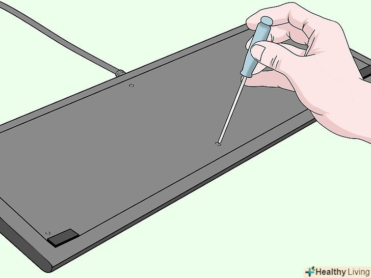 Якщо можна, розкрутіть клавіатуру і розкрийте її. Переверніть клавіатуру і пошукайте гвинти. Деякі клавіатури складаються з двох скручених разом панелей. Якщо на клавіатурі є гвинти, відкрутіть їх, зніміть нижню панель і почистіть її окремо. Перевірте, чи немає гвинтів під наклеєними на клавіатуру ярликами.[15]- Якщо клавіші не витягуються, в такому випадку зазвичай можна зняти лицьову панель. Потім вийміть клавіші, якщо це можливо, щоб краще почистити лицьову панель.