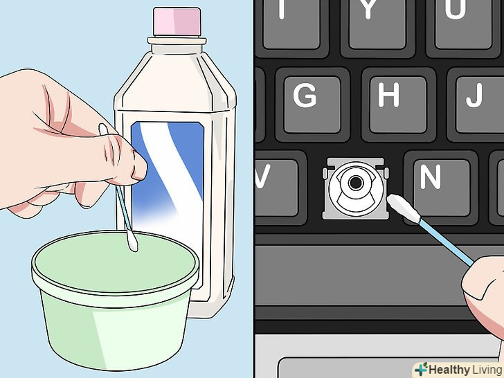 Очистіть гнізда для клавіш змоченими в спирті ватяними паличками.видаліть з клавіатури решту бруду та сміття. Гнізда для клавіш являють собою невеликі виступи або затискачі. Протріть кожен затиск з боків, щоб видалити з нього бруд. Після цього злегка змочіть ватяну паличку миючим розчином і протріть верхню частину кожного затиску.[19]- Коли ватяна паличка забрудниться, поміняйте її на чисту, щоб не залишати сміття при протиранні.