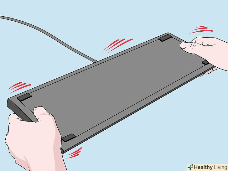 Переверніть клавіатуру догори дном, щоб витрусити з неї сміття.переверніть клавіатуру і потрусіть її. Дійте при цьому акуратно. В результаті з клавіатури випаде більшість крихт, сторонніх частинок, волосків та іншого сміття. При цьому нахиляйте клавіатуру під різними кутами і постукуйте по її нижньому боці, щоб витрусити якомога більше сміття.[2]- Прислухайтеся, чи не чути звук сміття, що перекочується в середині клавіатури. Такий звук може видавати механічна клавіатура та інші пристрої з піднятими клавішами. У цьому випадку подумайте про те, щоб розібрати клавіатуру і ретельно почистити її.