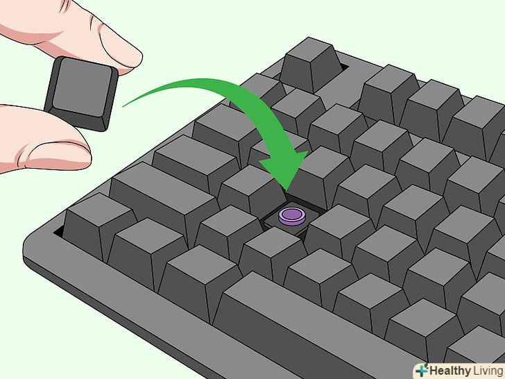 Зберіть клавіатуру і перевірте, як вона працює.виконайте в зворотній послідовності ті дії, які ви виконали при розбиранні клавіатури. Для більшості клавіатур спочатку необхідно з'єднати панелі. Скрутіть панелі разом, потім вставте клавіші у відповідні затискачі або гнізда. Зазвичай досить злегка натиснути на клавішу, щоб вона встала в гніздо.[20]- Якщо клавіатура не працює, перевірте, чи правильно ви зібрали її і під'єднали до неї всі дроти.