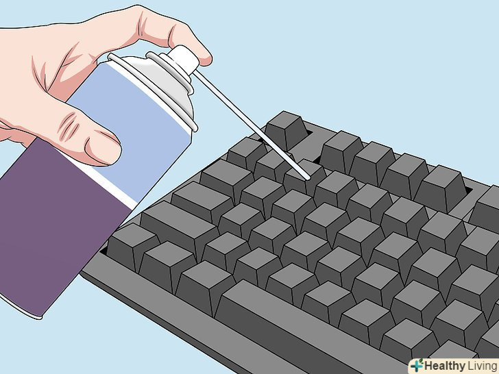 Видуйте з клавіатури пил і сміття за допомогою стисненого повітря.стиснене повітря є основним засобом поверхневої чистки клавіатури. Візьміть балончик під кутом 45 градусів і направте його на клавіші. Пройдіться струменем стисненого повітря по клавіатурі. При цьому тримайте сопло балончика в 1-2 сантиметрах від клавіш.[3]- Балончик зі стисненим повітрям можна придбати в магазині електроніки або товарів для офісу. Його можна також замовити через Інтернет.