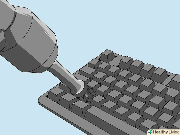 Видаліть застряглий сміття за допомогою пилососа. пилосос допоможе витягти більшу частину частинок, що застрягли між клавішами. Якщо у вас немає пилососа зі шлангом, спробуйте використовувати звичайний пилосос з насадкою у вигляді щітки. Пройдіться по всій клавіатурі і приділіть особливу увагу проміжкам між клавішами. Велика частина сміття ховається саме тут.[4]- Простежте, щоб всі клавіші надійно трималися на місці, особливо якщо ви маєте справу з ноутбуком. Якщо в пилосос засмокче будь-яку клавішу, дістаньте її з пилозбірника, помийте і поставте на місце. Надіньте клавішу на штир або затиск, щоб знову закріпити її на клавіатурі.
