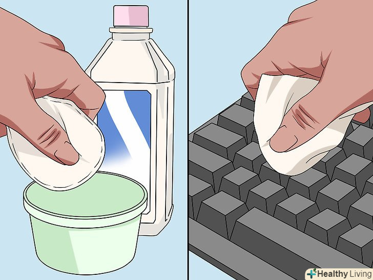 Протріть проміжки між клавішами змоченою в ізопропіловому спирті ватною паличкою.змочіть ватяну паличку лише трохи, щоб під клавіші не потрапила велика кількість вологи. Пройдіться ваткою навколо кожної клавіші, щоб видалити пил, жир та інший бруд. При необхідності повторіть це кілька разів і як слід очистіть бічні сторони кожної клавіші. Коли ватяна паличка забрудниться, поміняйте її на чисту.[5]- Ізопропіловий спирт дуже швидко висихає, тому він краще підходить для протирання клавіатури, ніж проста вода. Його можна придбати в аптеці або супермаркеті.
