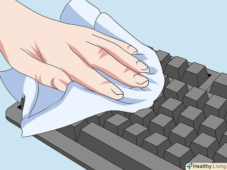 Протріть клавіатуру змоченою в спирті ганчіркою.щоб не занести нове сміття, візьміть безворсову тканину або паперовий рушник. З тканини не повинен капати спирт після того, як ви змочіть її. Видаліть пил та інше сміття з поверхні кожної клавіші.[6]- Придивіться до найбільш часто використовуваних клавіш (наприклад, пробілу і клавіші введення). Зазвичай на них накопичується більше бруду. Можливо, вам доведеться протерти ці клавіші кілька разів, щоб повністю очистити їх.