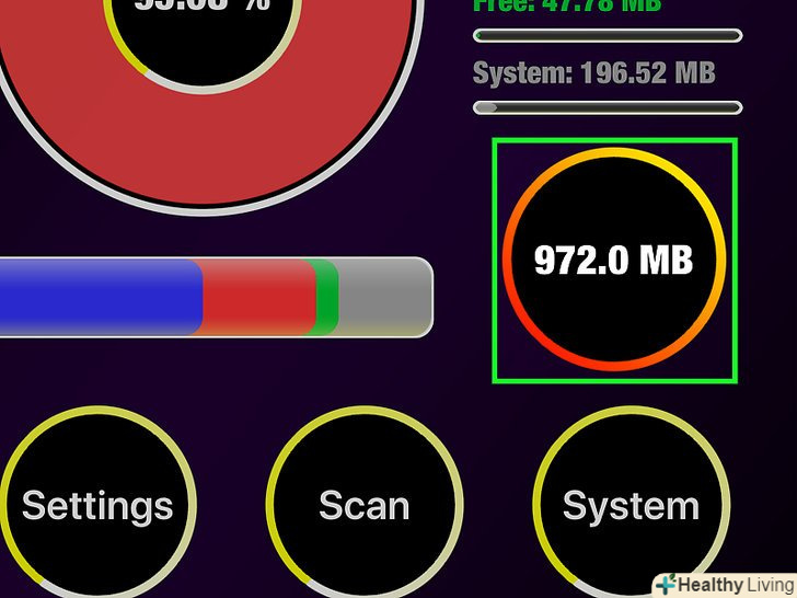 Дізнайтеся обсяг ОЗУ iPad.у нижньому правому куті відобразиться коло з числом, яке вказує на обсяг оперативної пам'яті пристрою.- Пам'ятайте, що на iPad додати оперативну пам'ять не можна.
