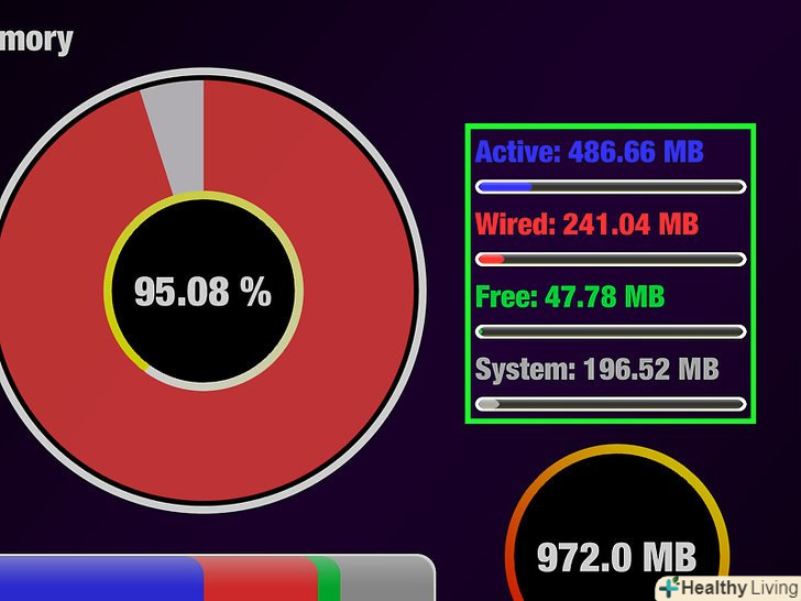 Перевірте, як пристрій використовує оперативну пам'ять.Внизу екрана ви побачите синю, червону, зелену і сіру смуги, які вказують на використовувану ОЗУ, постійно використовувану ОЗУ, вільну ОЗУ і використовувану системою ОЗУ.- На правій панелі у відсотках представлені використовувані обсяги ОЗП.