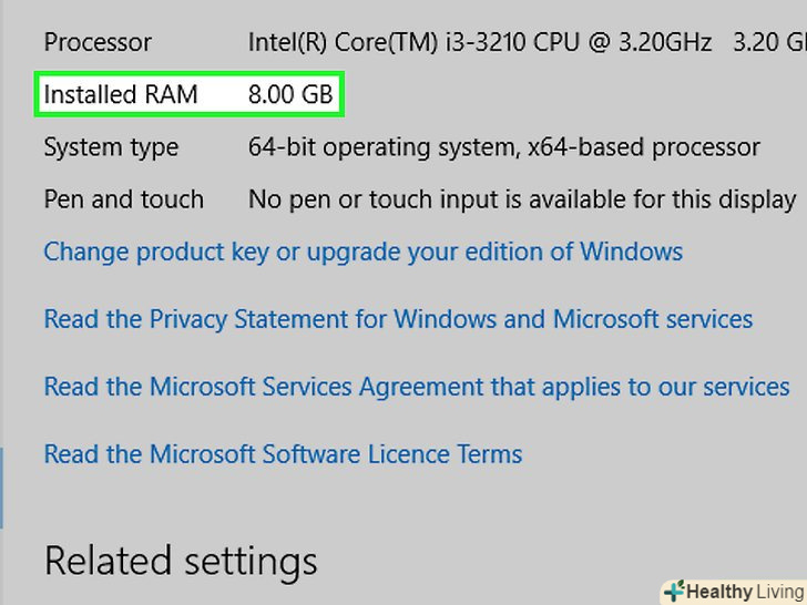 Знайдіть рядок "встановлена ОЗУ".вона знаходиться в розділі "Параметри пристрою" посередині вікна. У цьому рядку вказано обсяг ОЗУ комп'ютера.