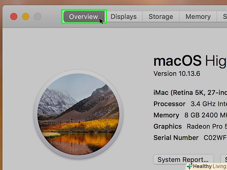 Перейдіть на вкладкуВідомості.вона знаходиться у верхньому лівому кутку.- За замовчуванням вікно "про це Mac" має відкритися на цій вкладці.