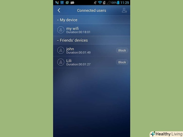 Подивіться підключених користувачів. торкніться піктограми "More Functions"("додаткові функції") у правій верхній частині екрана. Торкніться пункту " User Management "("Управління користувачами") в меню на лівій панелі. У правій частині екрана буде показаний список пристроїв або Користувачів, підключених до мобільного пристрою по WiFi. Звідси ви зможете заблокувати доступ до Вашого Wi-Fi для будь-якого пристрою або користувача.